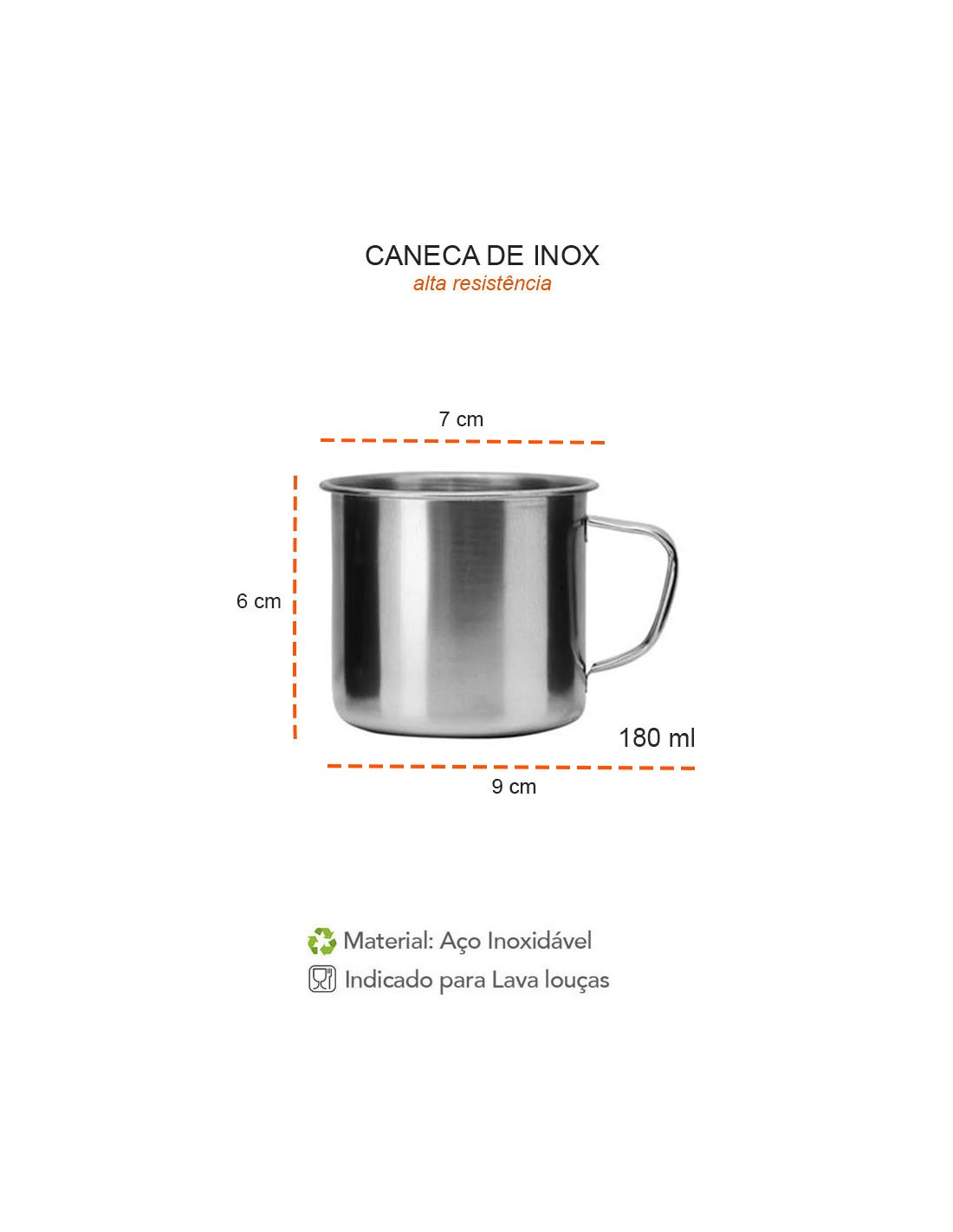 Mini caneca em aço inoxidavel. As mini canecas sao perfeitas para acampar ou super pratica para uso em restaurante, buffets, bares e lanchonetes. Pode ser usada na lava louças e tem muito mais durabilidade que as canecas produzidas em outros materiais.
