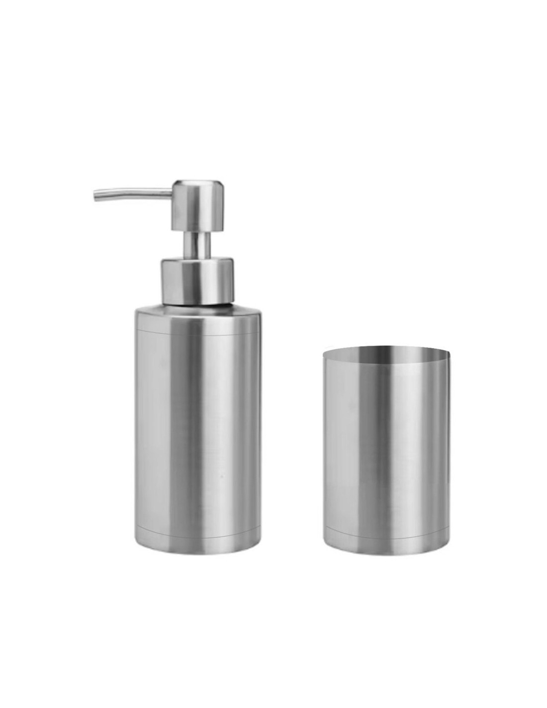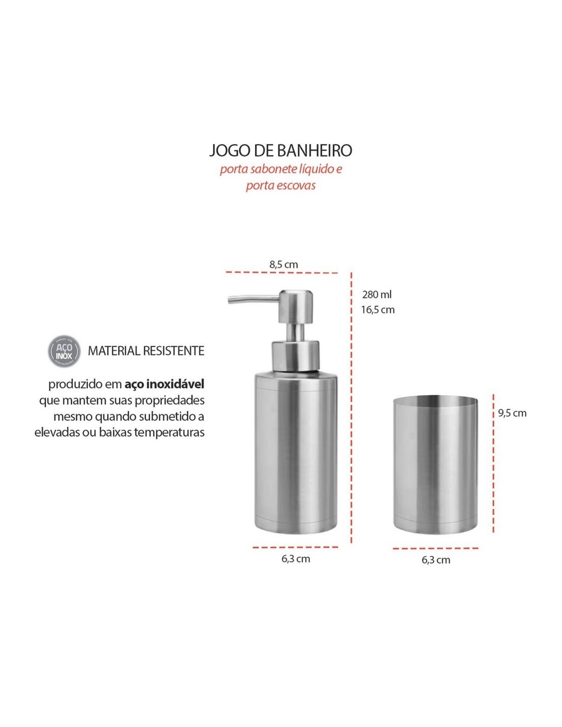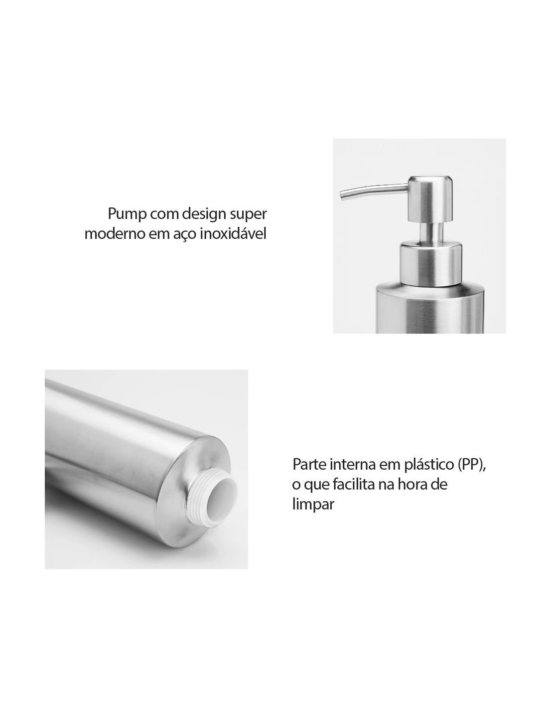 Porta sabonete liquido e escovas com design moderno e elegante. O porta sabonete produzido em aço inoxidavel alem de ser super funcional, é resistente e duravel. Parte interna em plastico (PP) para facilitar a limpeza e higienizaçao.