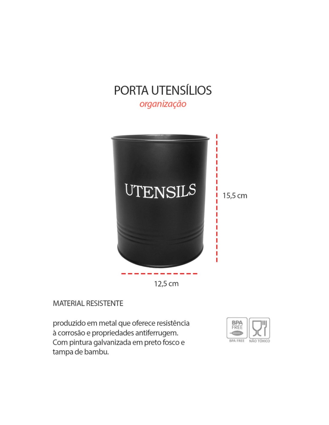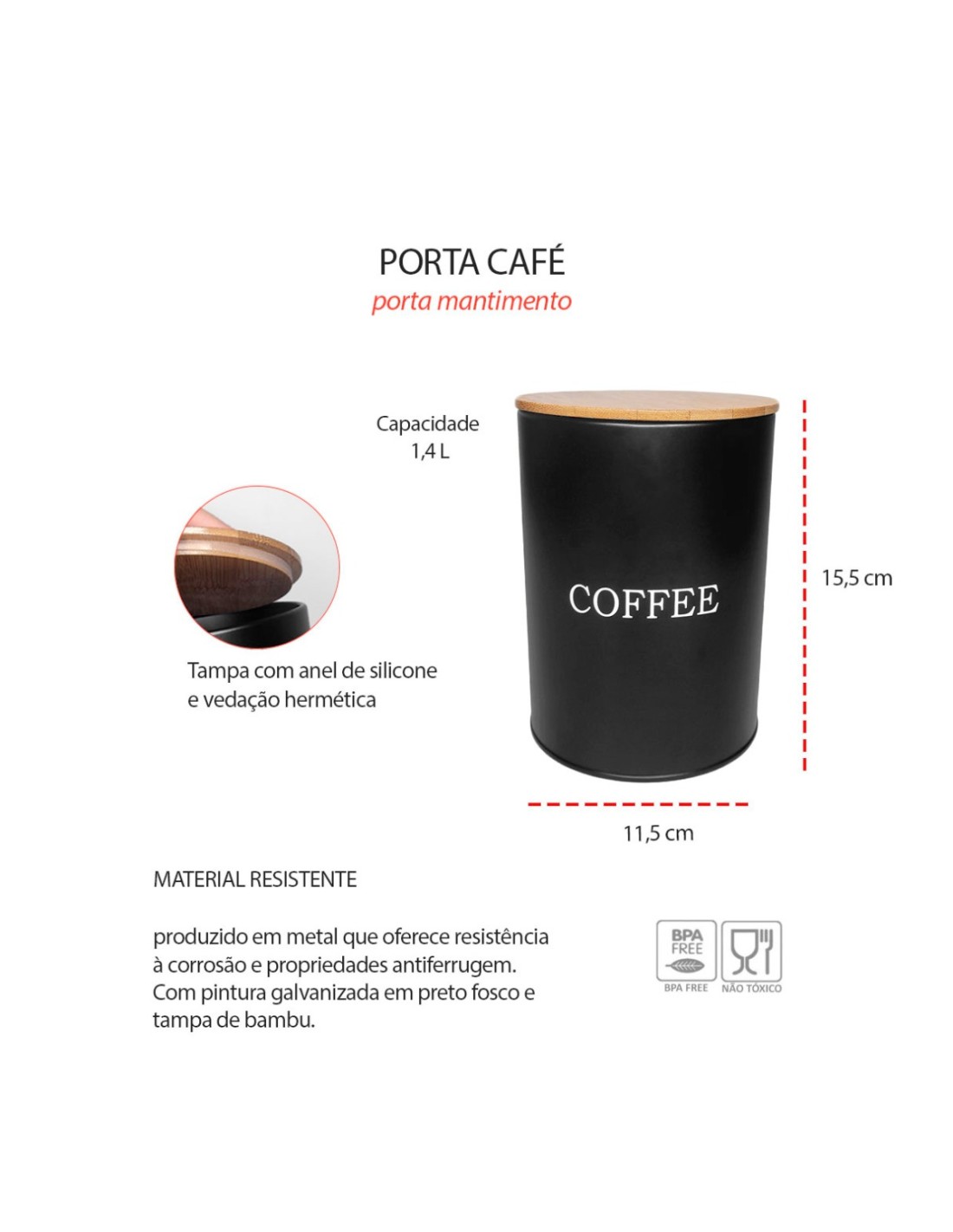 Porta utensilios, pote de cafe e açucar em lata com tampa hermetica. Potes sao produzidos em aço carbono e tampa de bambu. Os porta mantimentos possui pintura galvanizada interna e externa na mesma cor. Pote hermetico possui tampa de bambu com anel de silicone, acabamento resistente a corrosao e propriedades antiferrugem.