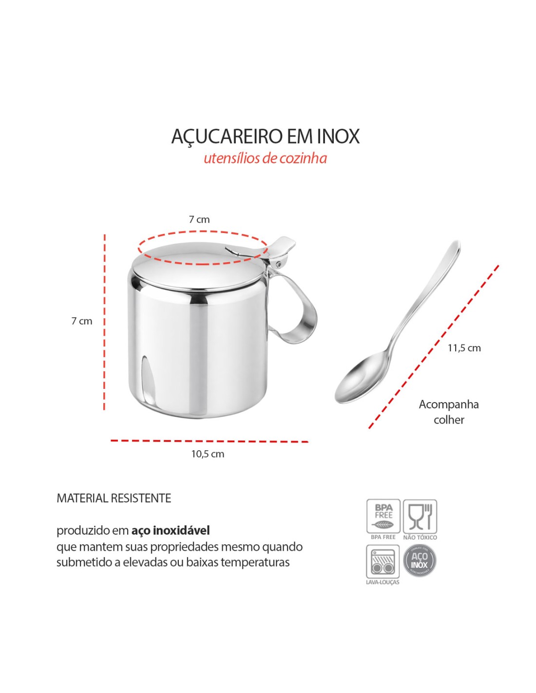 Açucareiro com tampa e colher de inox. O Porta Açucar define o que ha de mais classico em utensilios de cozinha, traz um design atemporal. Produzido em aço inox previne de impurezas, ferrugem e indicado o uso na maquina de lavar louça. Perfeito para cafeterias, bares e restaurantes.