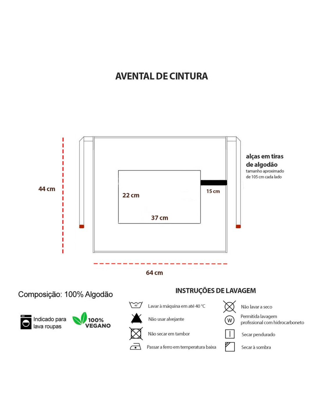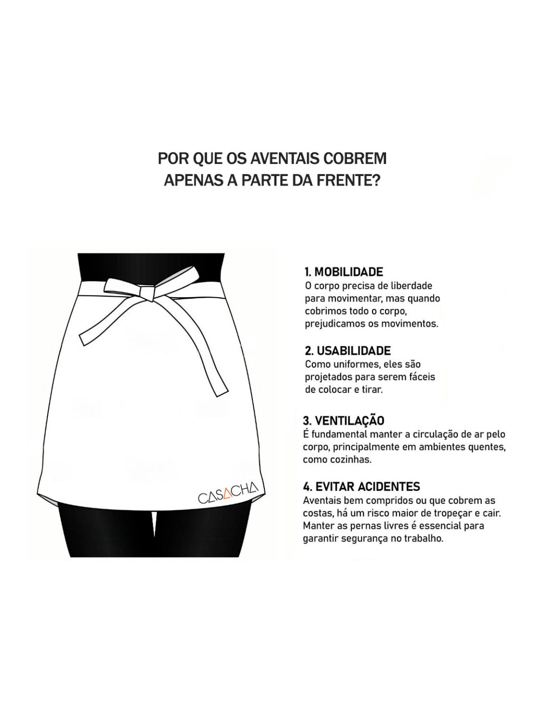 Avental de cintura unissex. Ajustavel na cintura, atraves das tiras para amarrar e bolso frontal. Ideal para chef de cozinha, barista, jardinagem, pintura e outros. Este avental é pratico, basico, veste bem e facil de lavar. O avental profissional da Casacha atende bem aos clientes mais exigentes priorizando conforto, qualidade e estilo.