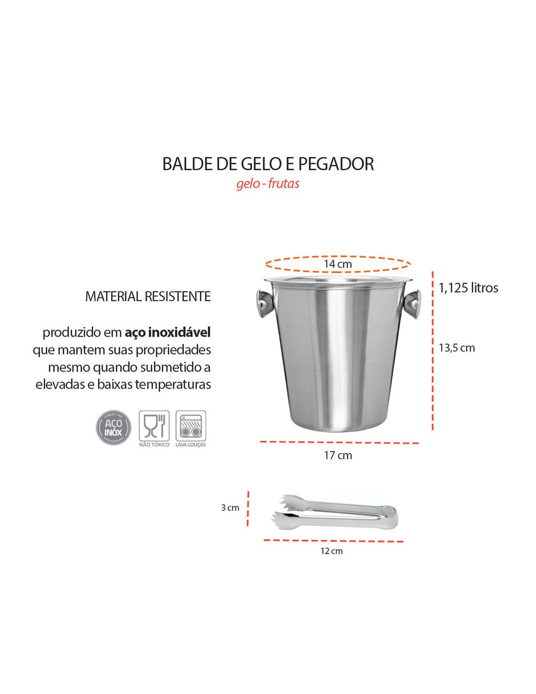 Balde de gelo e pegador produzido em aço inoxidavel. Essencial para festas e reuniões, o balde de gelo é ideal para conservar as bebidas na temperatura certa. O balde suporta altas e baixas temperaturas, é um produto moderno e elegante. Pratico e facil de lavar, pode ir na lava louças, aço inox escovado, nao deixa mancha.
