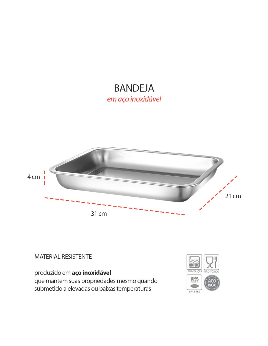A bandeja assadeira retangular em aço inox é pratica, resistente e versatil para o preparo e organização de alimentos no dia a dia. Seu formato fundo ajuda a conter liquidos e molhos, sendo ideal para assar, servir ou organizar alimentos com mais praticidade. Produzida em aço inox, é duravel, facil de limpar e combina com diferentes ambientes da cozinha, podendo ser usada tanto no preparo quanto na apresentação de pratos.