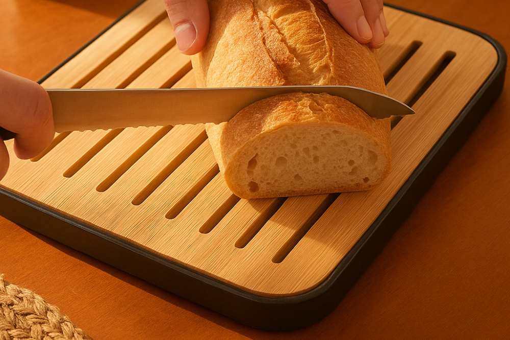 O pao costuma ser o protagonista da mesa de cafe. Para servir de forma organizada e sem sujeira, alguns itens sao indispensaveis. A tabua migalheira permite cortar paes sem espalhar migalhas pela mesa ou bancada.
