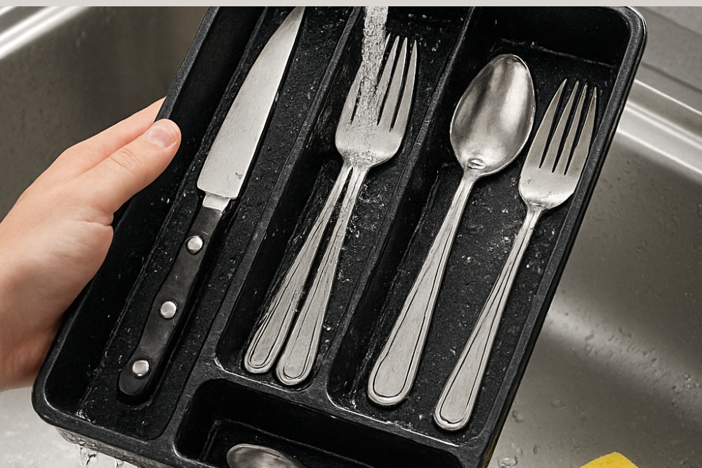 • Separe os talheres por categoria: garfos em uma divisao, colheres em outra, facas na parte adequada.