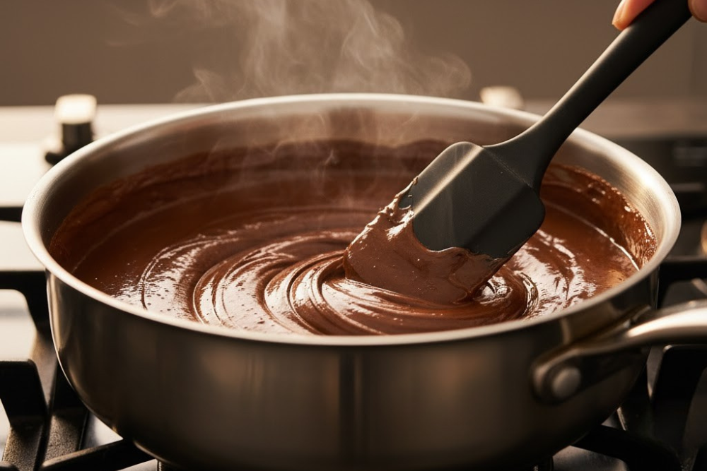A espatula de silicone é ideal para mexer o brigadeiro durante o cozimento, evitando que o doce grude na panela e permitindo atingir o ponto correto com mais facilidade.