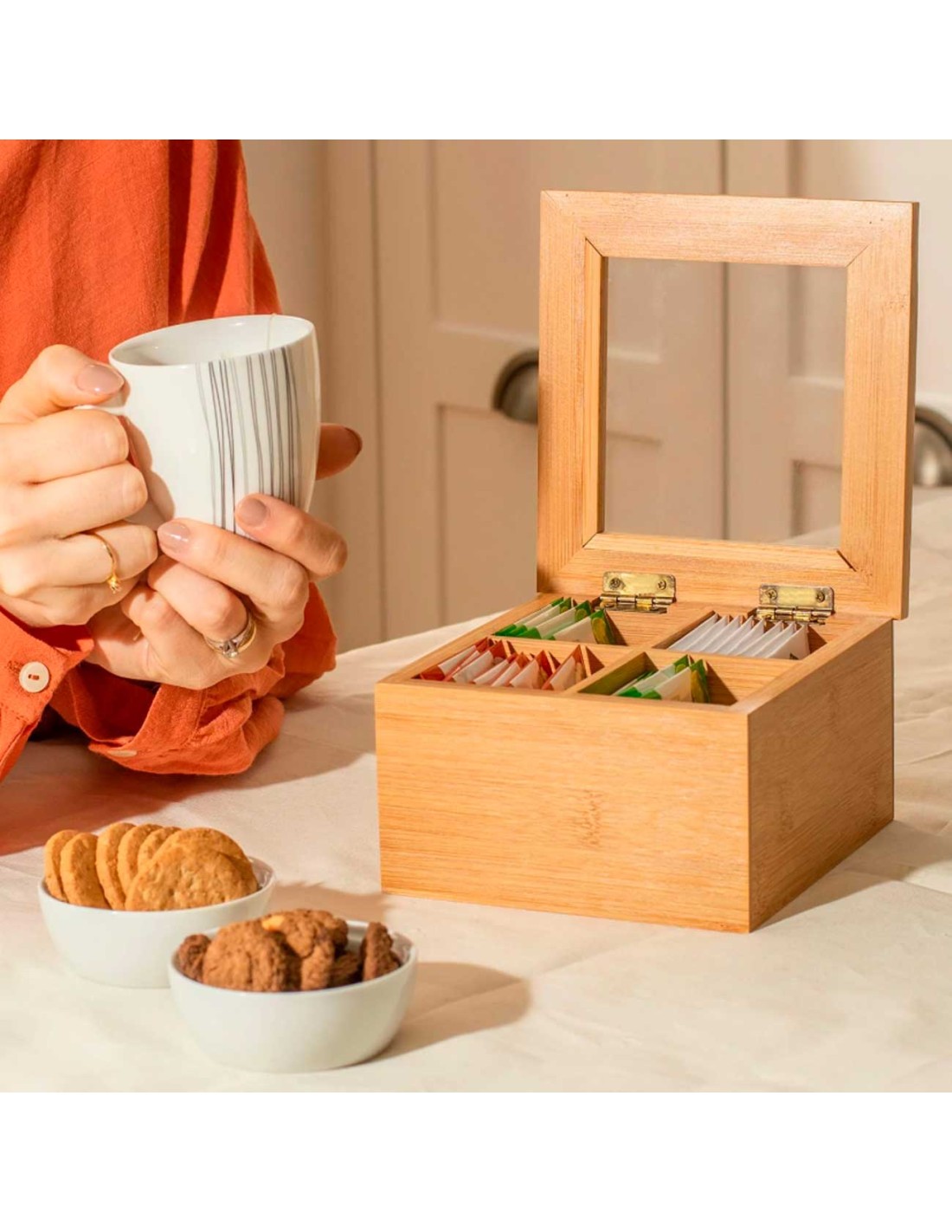 O organizador de cha com 4 divisorias é pratico, funcional e ideal para manter saches sempre visiveis e bem acomodados. Feito em bambu, material 100% renovavel, une sustentabilidade, beleza natural e durabilidade. A tampa com visor transparente facilita a visualizacao rapida do conteudo, trazendo mais praticidade para a rotina. Com design sofisticado,...