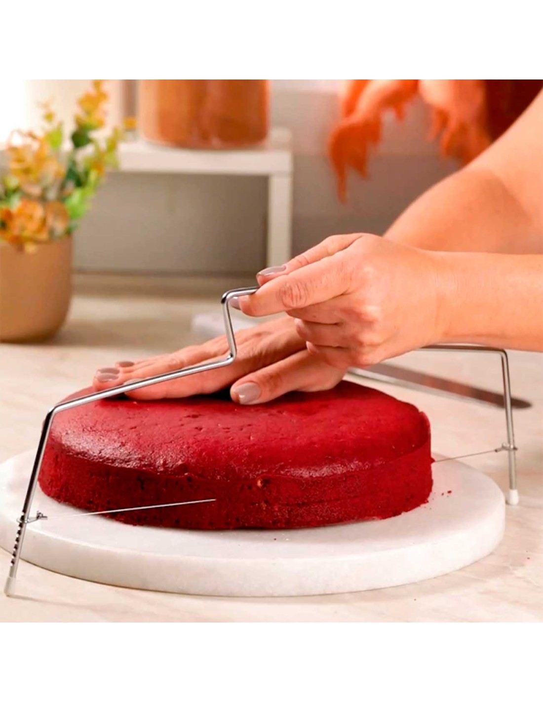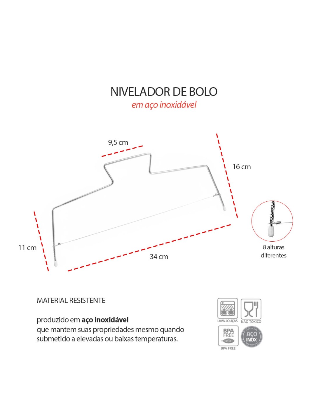 Cortador e nivelador de bolos. O nivelador de bolos em aço inox e fios duplos sao essenciais para confeiteiros e amantes da confeitaria. O cortador possui estrutura resistente e duravel, os fios duplos sao afiados e deslizam suavemente atraves do bolo sem desmoronar ou esfarelar. A altura dos fios é ajustavel em até 8 alturas diferentes.