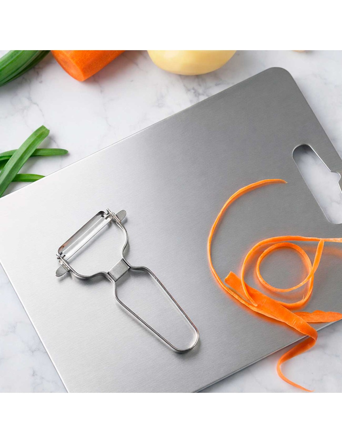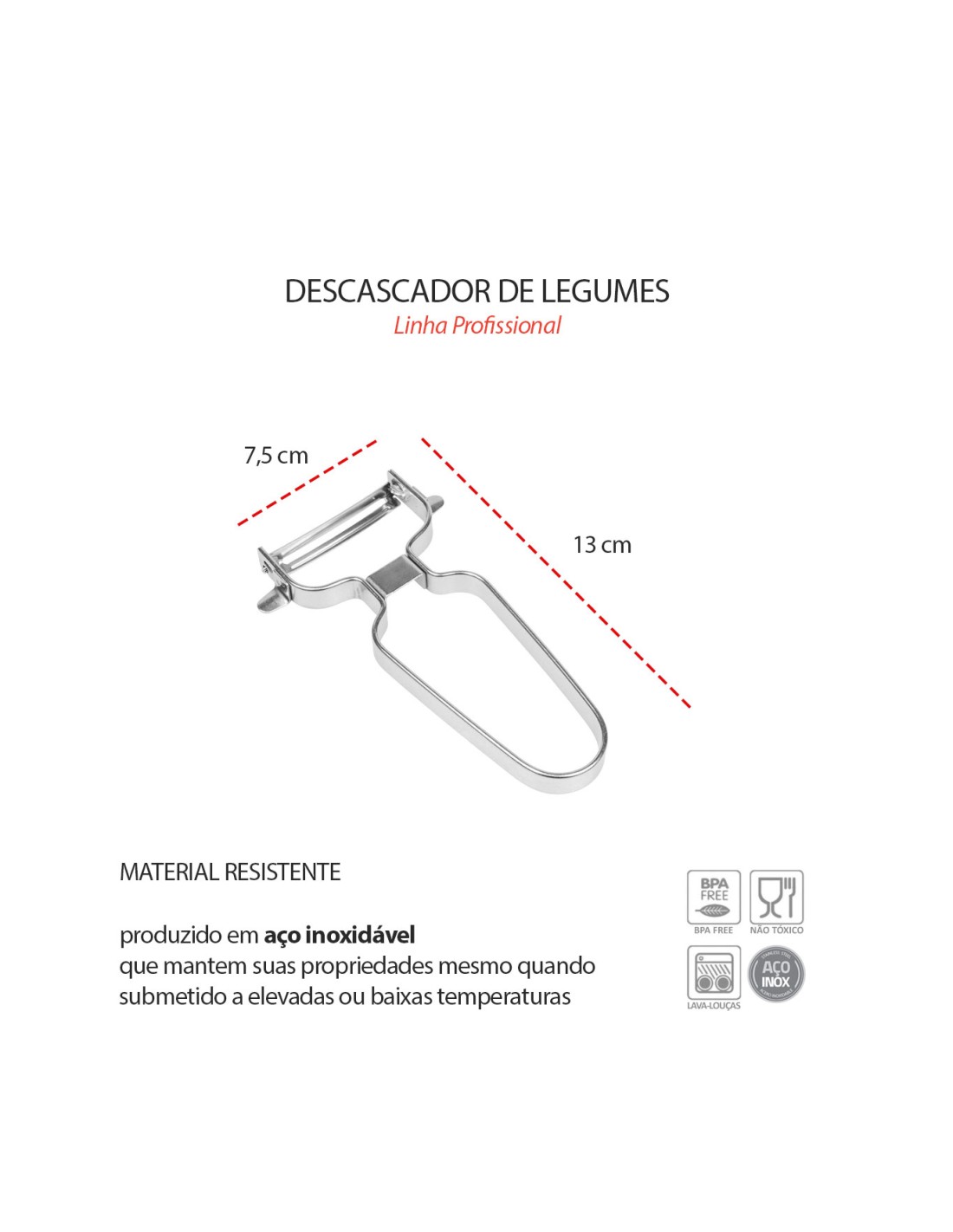 O descascador de legumes em aço inox oferece mais higiene e praticidade no preparo dos alimentos. Por ser fabricado em aço inox, é mais higienico, nao retém odores e é muito mais facil de limpar, garantindo maior segurança alimentar no uso diario. Sua lamina resistente proporciona cortes precisos e eficientes, tornando o preparo mais rapido e funcional na cozinha.