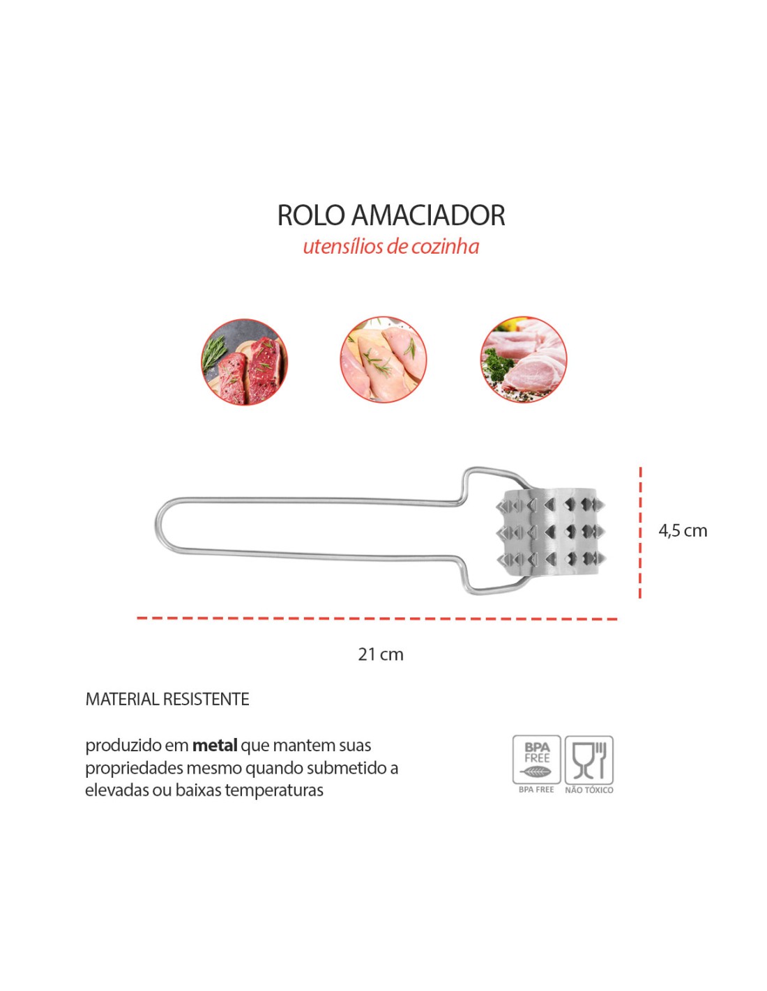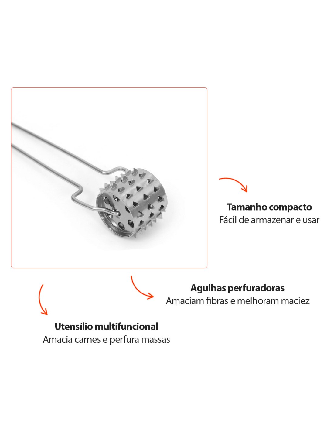 O rolo amaciador de carne é pratico e funcional para deixar carnes mais macias e saborosas no preparo do dia a dia. Produzido em metal resistente, oferece durabilidade e facilita a limpeza. Possui agulhas que perfuram a carne, ajudando na penetraçao de temperos e reduzindo o tempo de cocçao. Com design ergonomico, permite uso firme e seguro, sendo ideal para cozinha domestica, churrascos ou uso profissional.