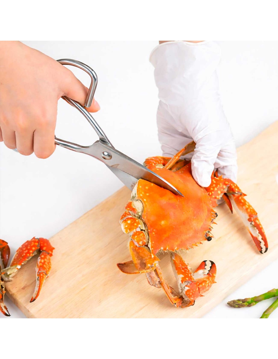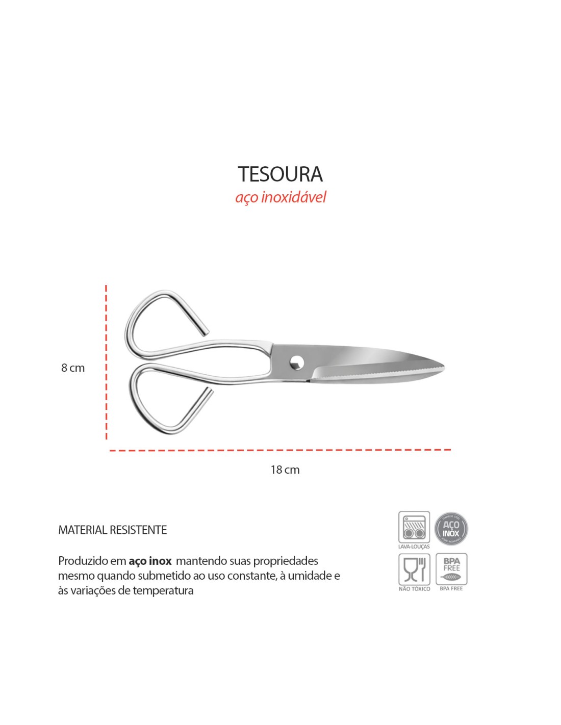 A tesoura de cozinha é multiuso, pratica e funcional para auxiliar no preparo de alimentos com mais eficiencia. Produzida em aço inox, é resistente, nao enferruja e facilita a limpeza, garantindo durabilidade no uso. Suas laminas afiadas permitem cortar carnes, ervas, embalagens e diversos ingredientes com mais precisao. Possui design ergonomico que proporciona conforto e firmeza no manuseio, sendo uma opçao pratica para o dia a dia.