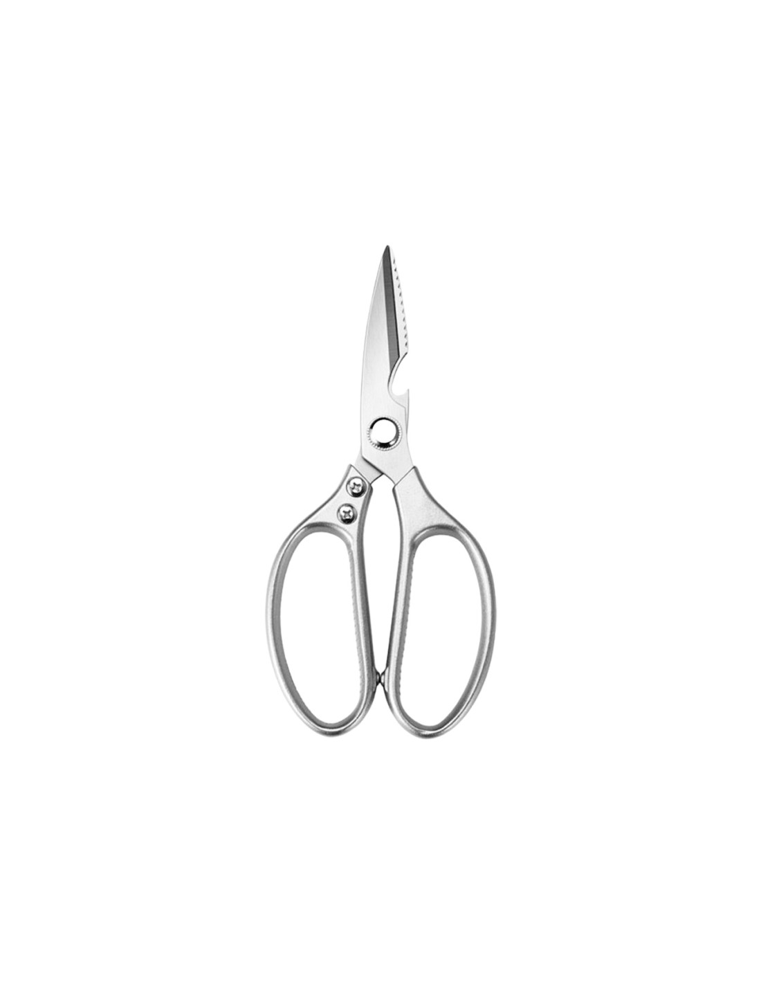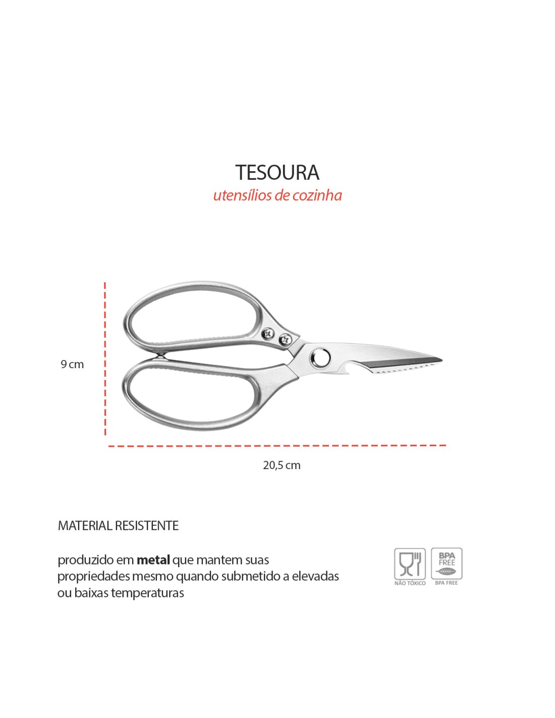 A tesoura de cozinha multiuso é pratica e resistente para diversas tarefas no dia a dia. Produzida em metal, oferece durabilidade, firmeza e facilidade na limpeza. Possui lamina reforçada ideal para cortar frango, peixes e outros alimentos, alem de funçao descamador e abridor de garrafa, trazendo mais versatilidade. Com design funcional, proporciona mais controle e eficiencia no manuseio, sendo uma opçao pratica para a cozinha.